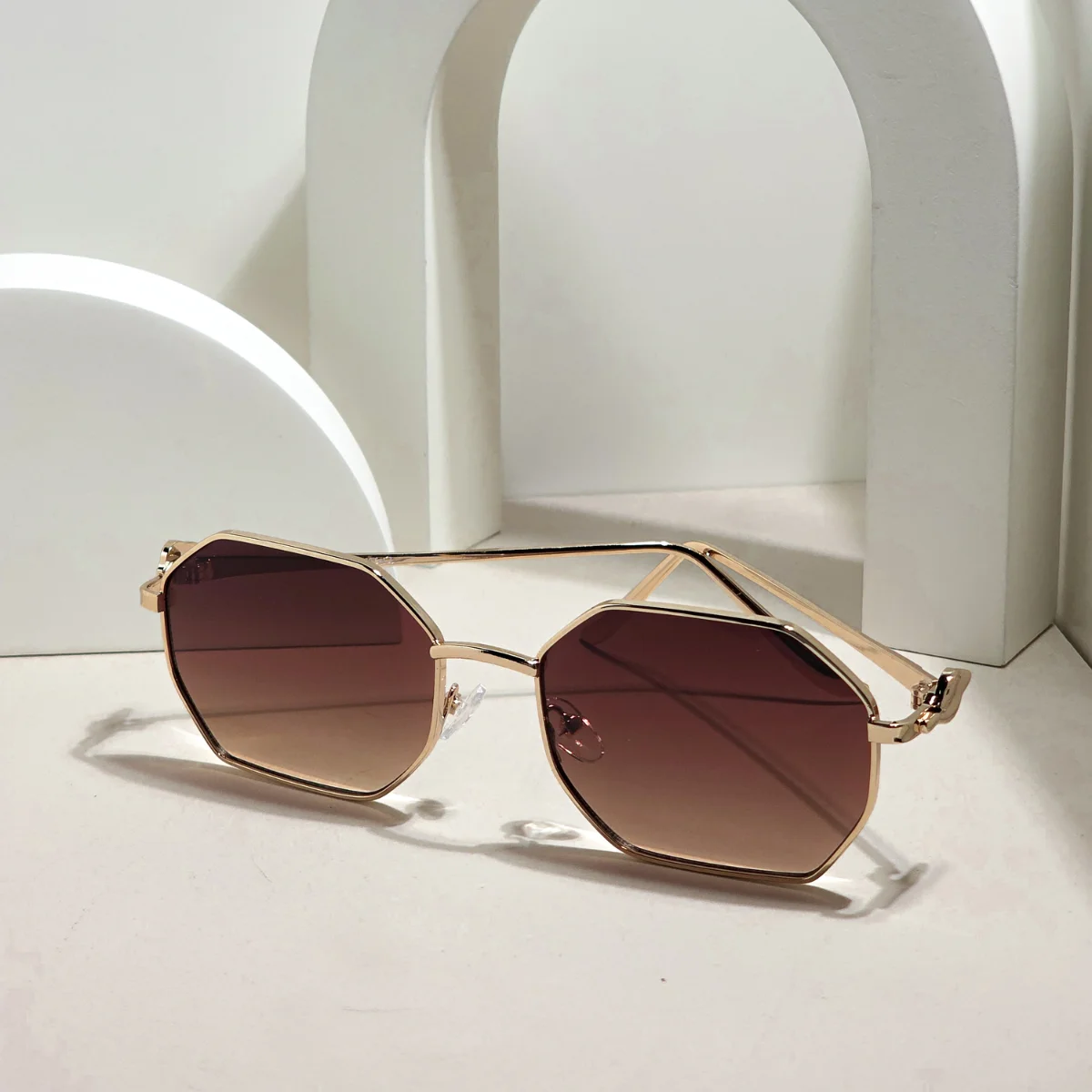 A DYESWAP 802 napszemüveg egyik legizgalmasabb eleme a nyolcszögletű lencseforma, amely egyszerre vintage és modern. Az arany fémkeret vékony, kecses vonala követi a lencse éleit, így a design stabil és kifinomult, de sosem lesz túlzó. A barna ombre lencse természetes átmenete elegáns játékot ad a fénynek — ez az árnyalat különösen jól mutat bőrszíntől függetlenül.